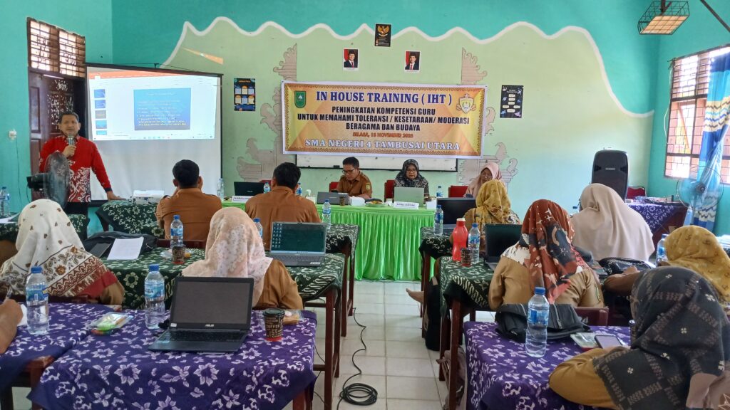 Tambusai Utara, Mahato, Bandar Selamat – (Selasa, 18 November 2025) – Dalam rangka peningkatan kompetensi guru untuk memahami toleransi/kesetaraan/moderasi beragama dan budaya, SMA Negeri 4 Tambusai Utara menggelar kegiatan In House Training (IHT). Dosen Pasca sarjana Universitas Lancang Kuning Riau Bapak Assoc. Prof. Dr. H. Nurfaisal, M.Pd. sebagai pemateri.